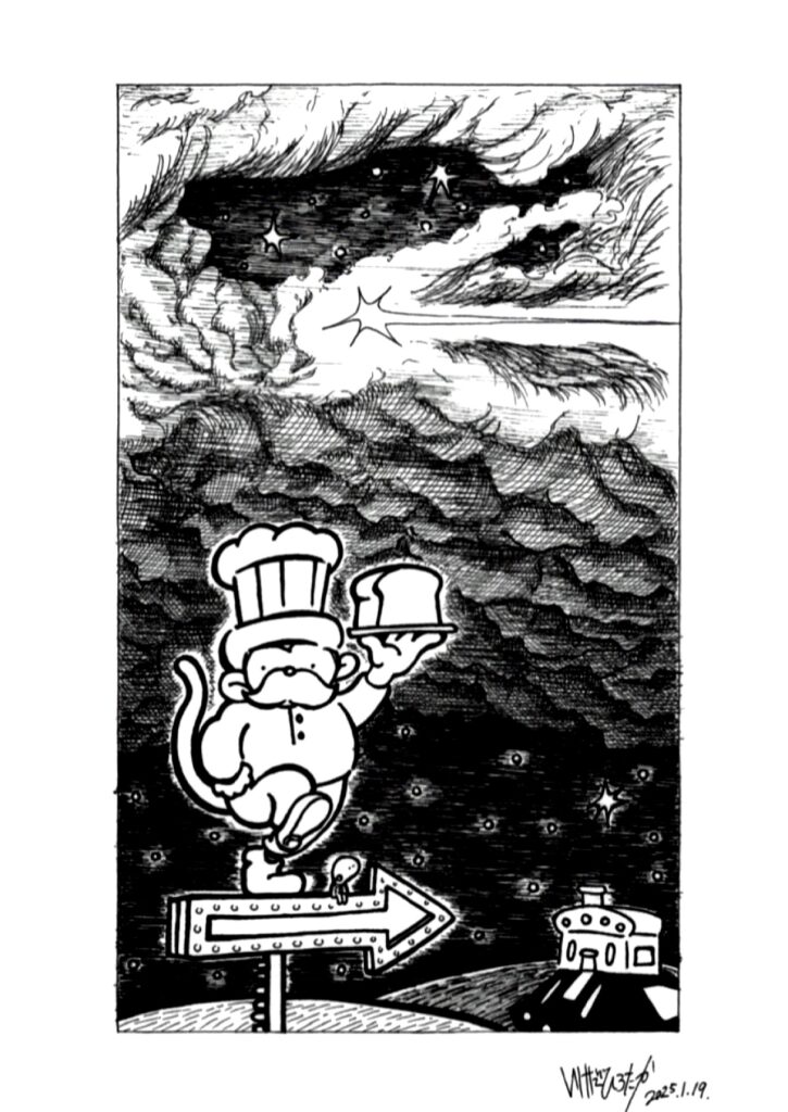 そんななか、くしゃみだけは、「お猿のパン屋」の看板に座って、毎晩訪れるこの数秒間の隕石の移動を7ヶ月間途切れることなく観察しつづけました。もちろん、店主のお猿には許可を得ています。週2でパン屋に通っているので、店主とは仲良しなのです。パンが直置きではないところが、なによりもお気に入りでした。